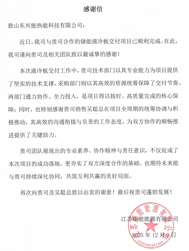 储能液冷板交付项目圆满完成:江苏某能源公司致谢山东